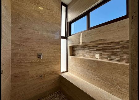 - Recubrimiento en baños con mármol travertino Fiorito en área de regadera.